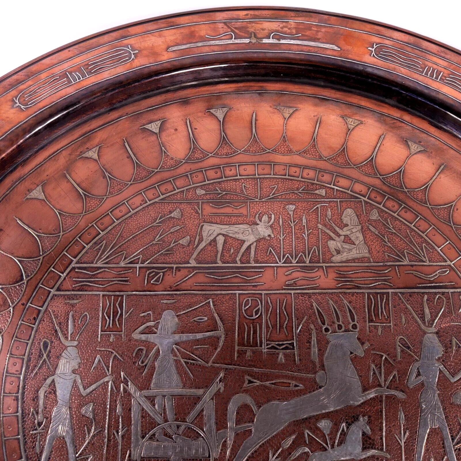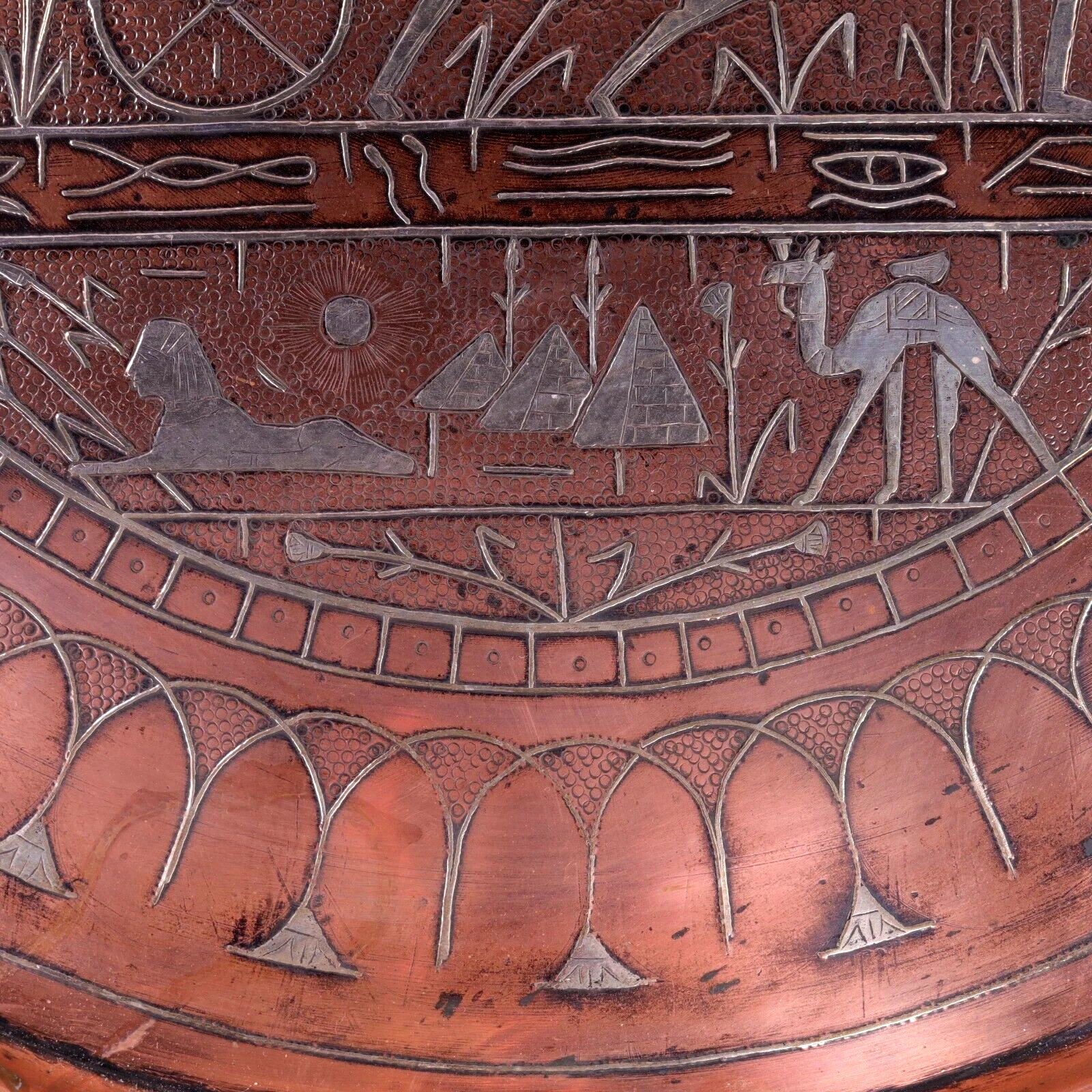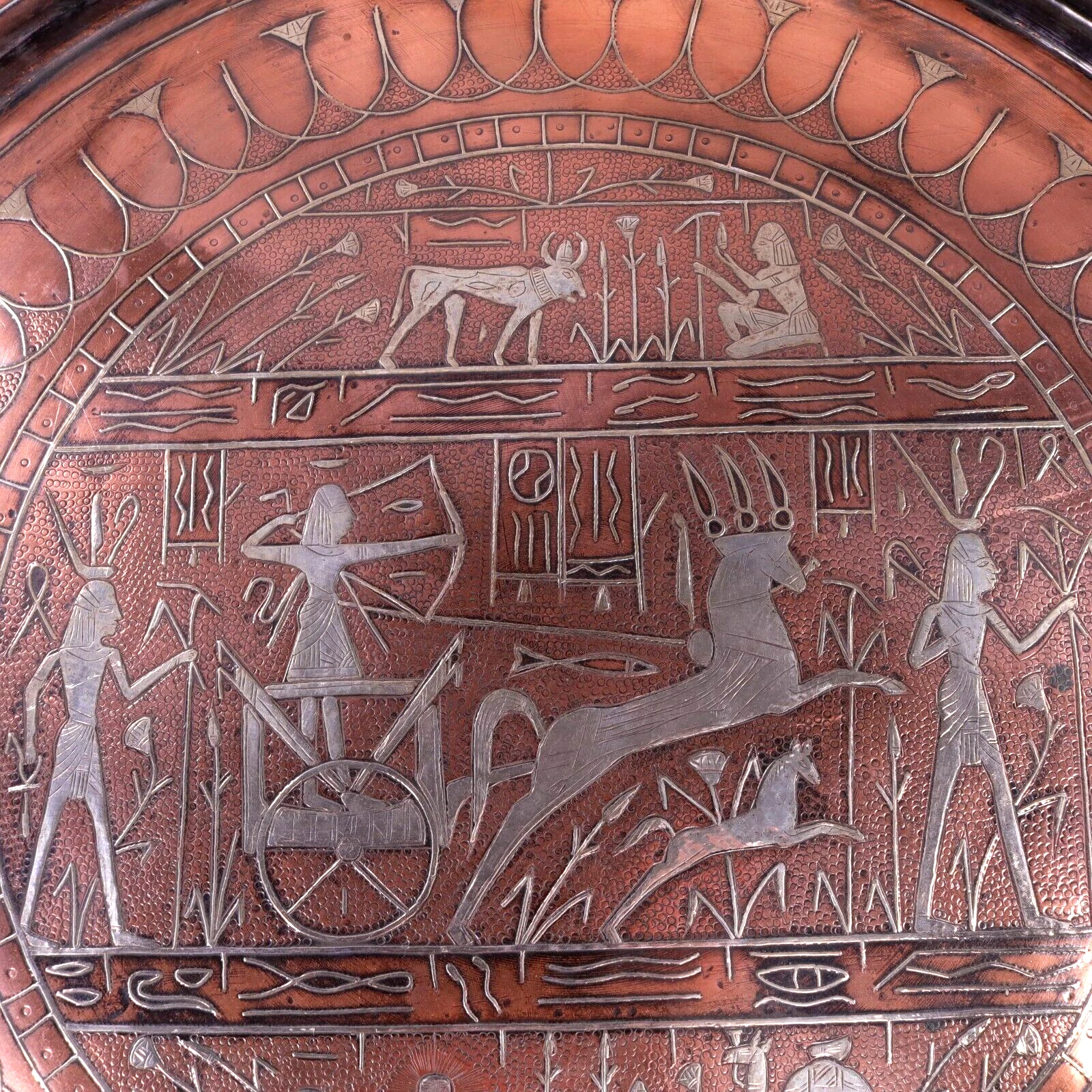 A quite simply stunning and massive Grand Tour charger decorated with inlayed silver Egyptian hieroglyphs, pyramids, Sphinx, animals, people and stylised Scrab beetles.