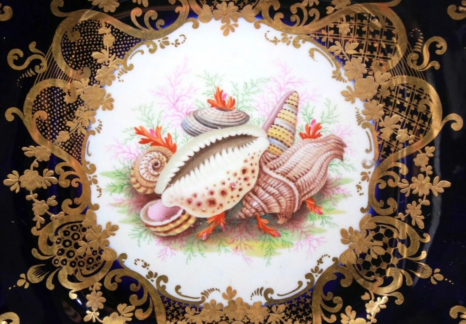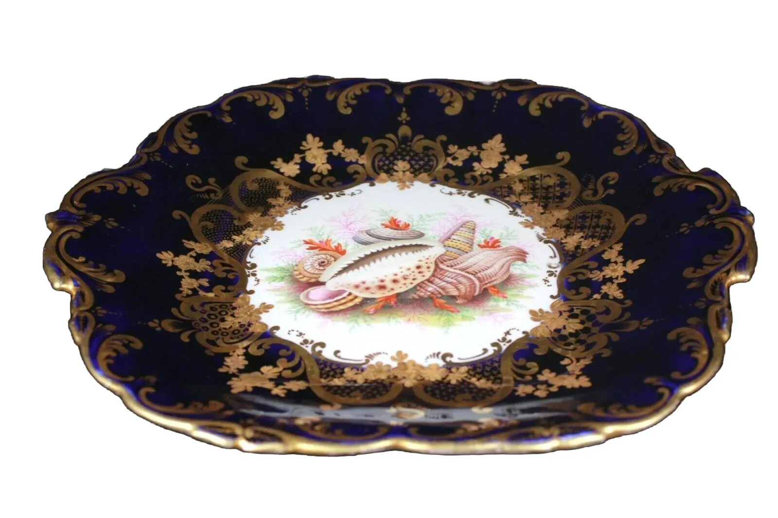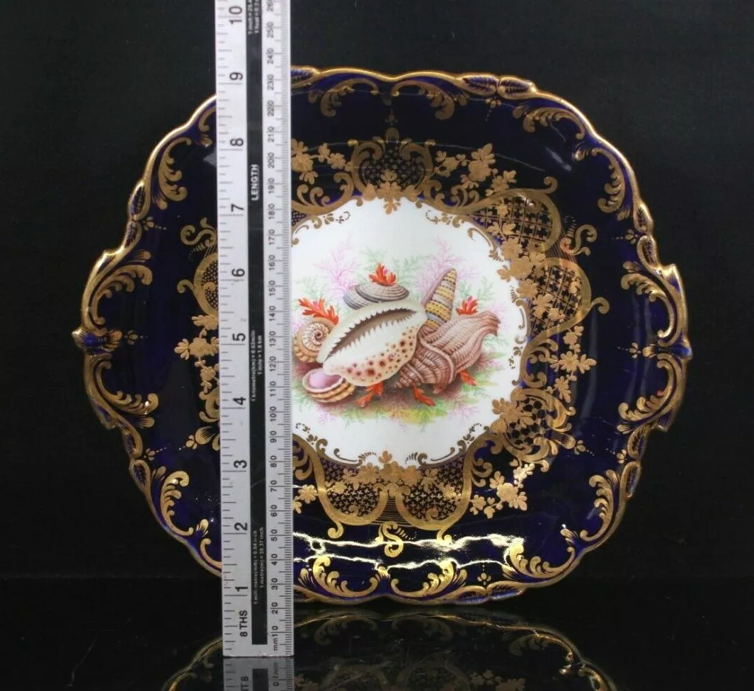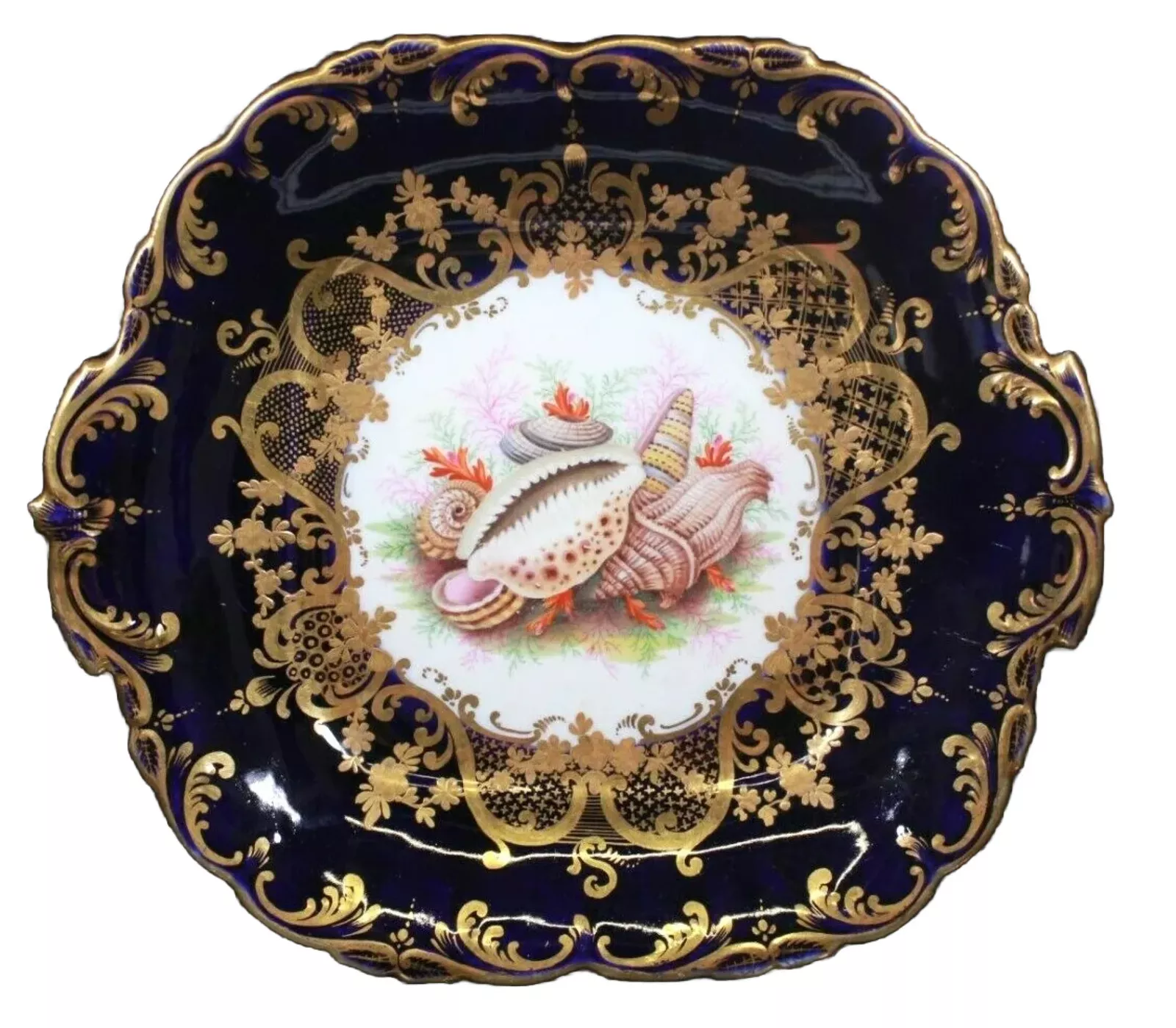 Item:Â A rare and very beautiful John Rose, Coalport square dessert plate wonderfully hand painted seashell group possibly by John Barker (Parker), against a deep cobalt blue and a raised gold gilded period decorations.